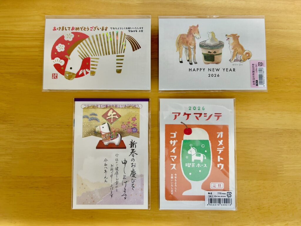 2026年度の年賀状達。毎年ロフトで買っているので、村田夏佳さんの柴犬シリーズと喫茶店シリーズが毎年増えていく
